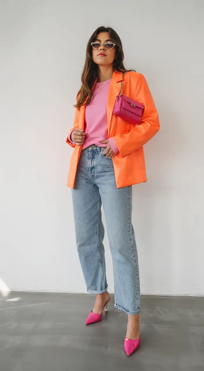 This ensemble features an energizing color pair of orange blazer combined with pastel pink tee to form its distinctive style. The combination of straight-leg jeans with fuchsia heels creates a youthful appearance when used with color-blocking elements. A mini pink bag equipped with chain decoration teams up with white cat-eye sunglasses to complete the stylish ensemble. People who love daring street fashion will find the perfect match in this combination because it embodies the daring nature of modern casual women’s wear.