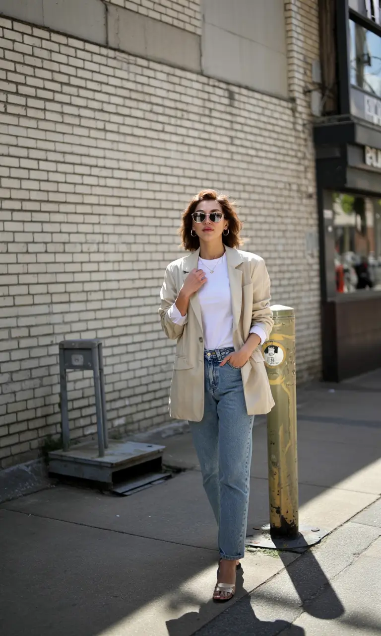 The outfit begins with a beige blazer followed by a white T-shirt and straight-leg blue jeans. The relaxed style of tailoring combined with rolled-up sleeves makes the blazer appear like a piece that has seen plenty of wear. The relaxed denim pair brings comfort and flexibility to the outfit alongside basic accessories which maintain its neat look. The urban-modern combination creates everyday summer wear suitable for modern casual attire among women.
