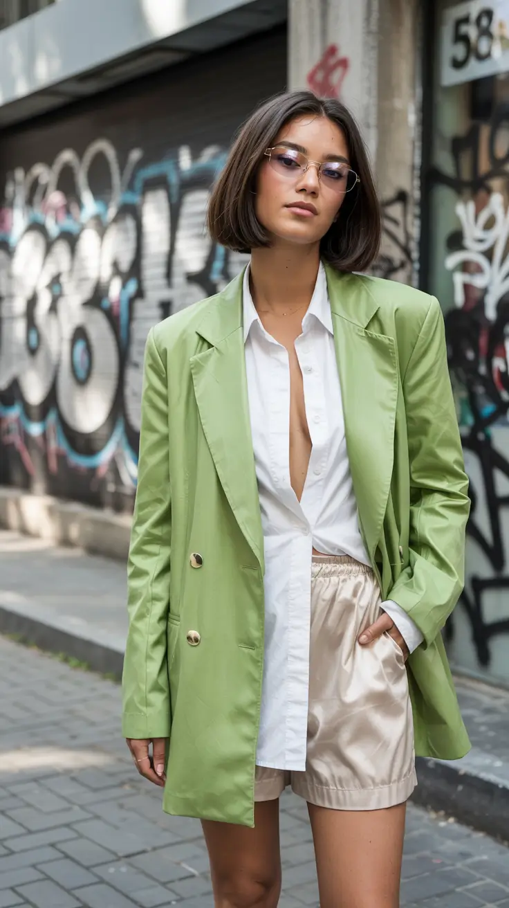 The outfit features a light green double-breasted blazer with a crisp white shirt where the top buttons remain unbuttoned. An elegant layered effect occurs through the combination of satin cream shorts with plain blue jeans. A long blazer provides relaxed comfort yet the fitted shirt brings elegance to the whole ensemble. Women summer 2025 blazer outfits receive a fresh update through this subtle luxurious outfit design.