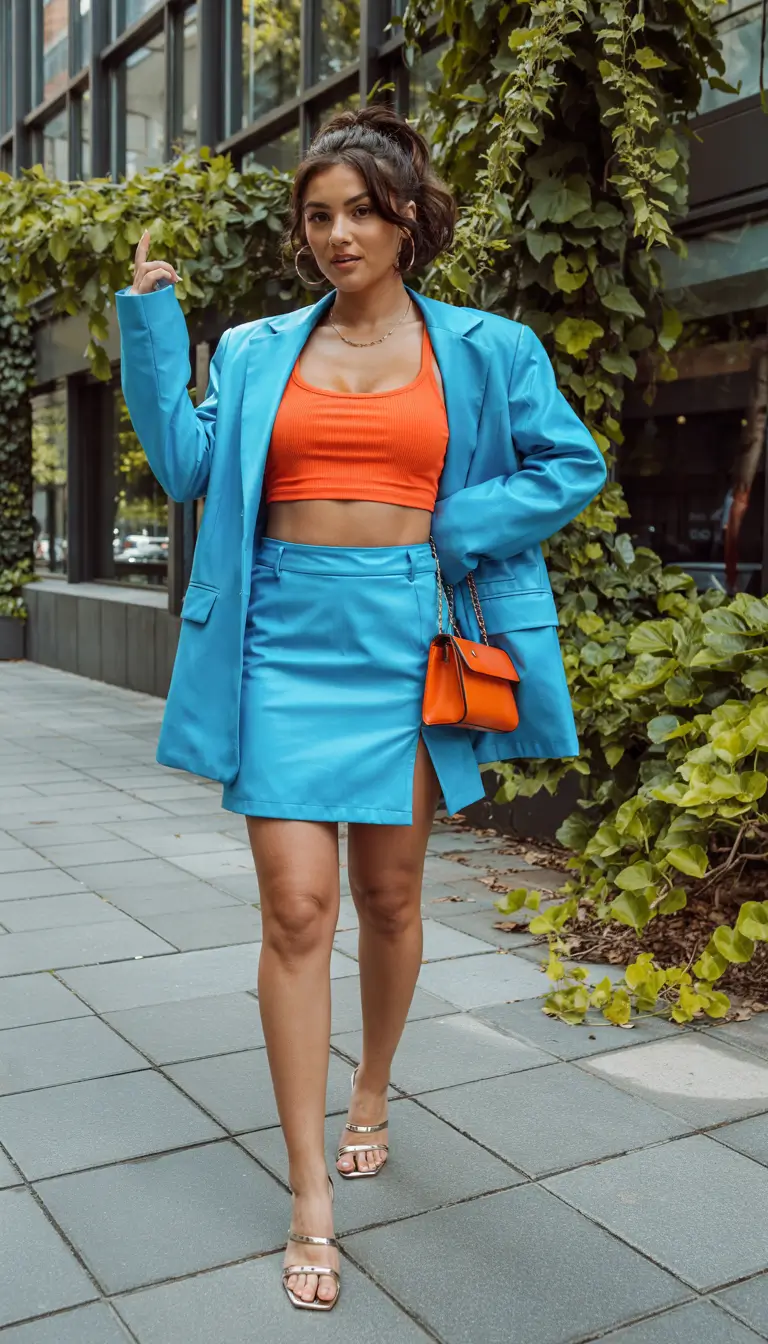 The attention-grabbing outfit begins with blue blazer and matching mini skirt combination which creates an eye-catching structure. The orange crop top fits tightly to create lively contrast between it and the outfit. An orange mini bag holds the ensemble together as strappy heels provide urban sophistication to the outfit. This street-suitable outfit produces an attention-grabbing impact for hot summer days.