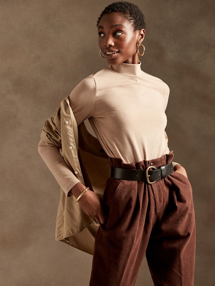 Here’s a classic turtleneck with a modern twist. The light beige color is trendy yet modest, perfect for the minimalist woman’s spring wardrobe. Its size-inclusive fit guarantees comfort and style, making it an essential piece for both work and leisure.