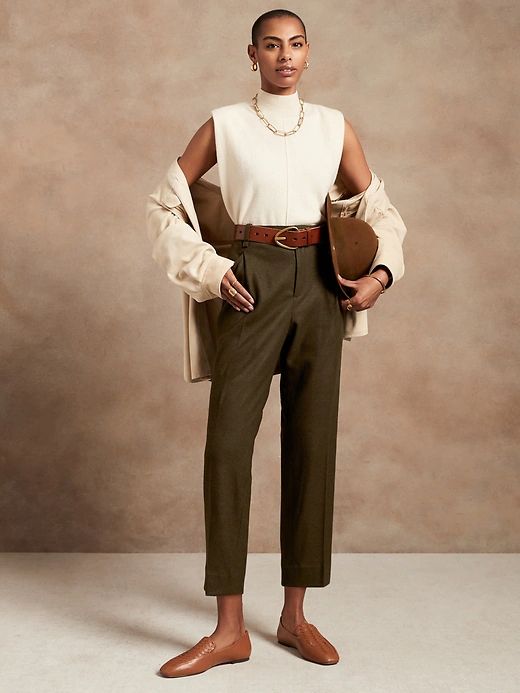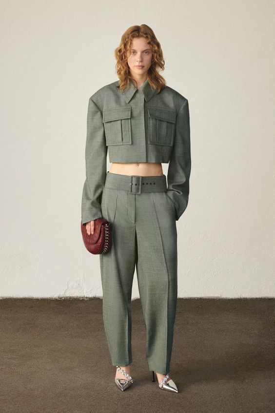 Embrace the classic trend with a military-inspired woman’s suit. This ensemble features a cropped jacket with pronounced pockets, paired with high-waisted trousers that offer a flattering size option for various body types. The olive green hue is both earthy and modest, ideal for those who prefer casual yet trendy work attire. It’s a look that pays homage to French chic with a modern twist, perfect for April’s unpredictable climate.