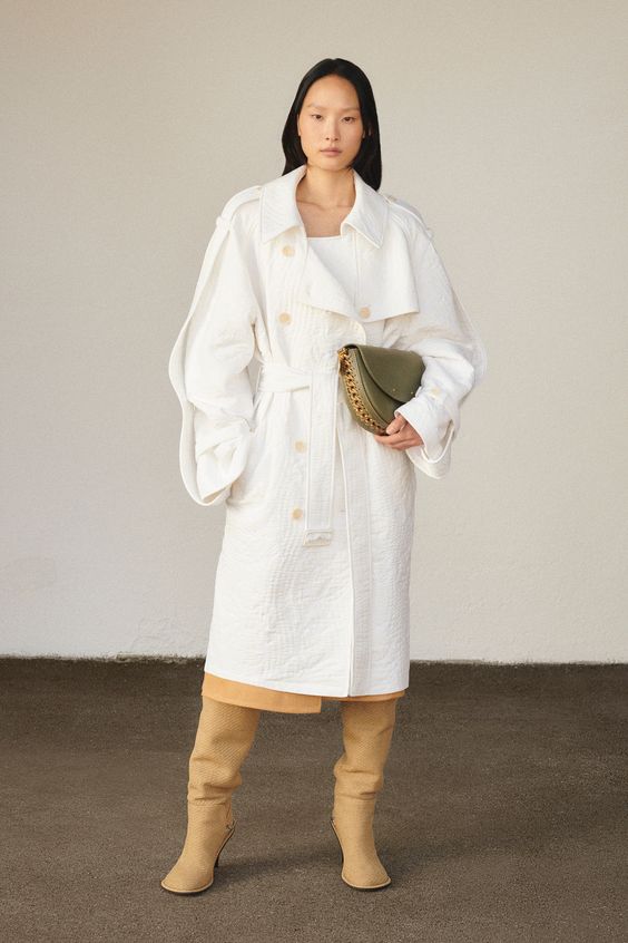 This textured white trench coat is a spring essential, offering a bright and classic look that’s both cute and casual. It’s an ideal choice for a woman looking for a trendy yet modest addition to her wardrobe, suitable for those unpredictable warm or cold days.