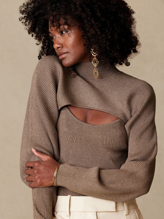 The cut-out sweater is a bold yet modest addition, perfect for the woman who enjoys a hint of allure while maintaining an air of professionalism. The earthy tone maintains the minimalist theme, while the strategic cut-out offers a trendy twist. This piece is versatile, pairing effortlessly with trousers or skirts, making it a go-to for women who balance work and weekend gatherings with ease.