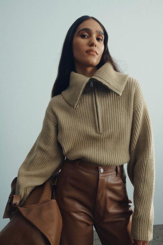 Innovation meets classic style with this zip-up turtleneck. Its structured design and neutral palette make it a basic yet chic choice for the everyday woman. The zip feature adds a trendy edge and practicality, allowing for adjustable necklines to suit changing temperatures. Styled with leather pants, it’s the perfect blend of modest and modern for the workplace or a weekend city stroll.
