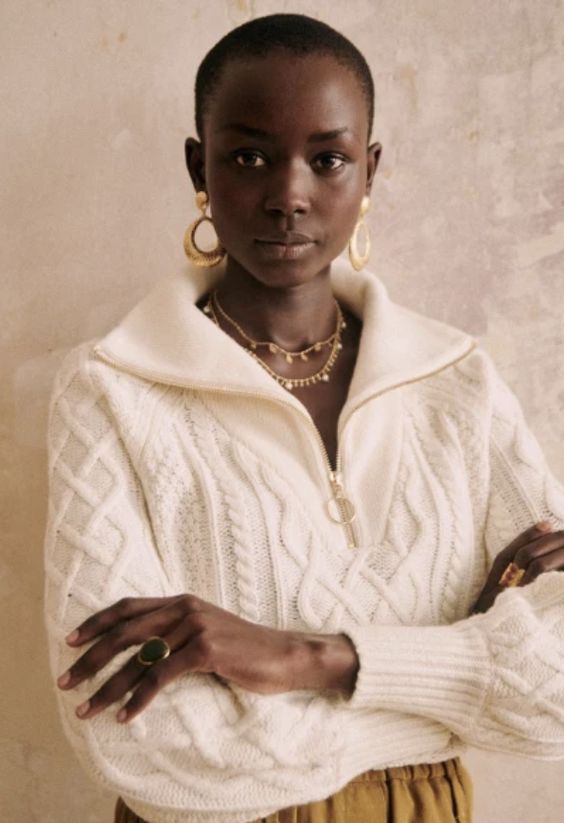 This season, the cable knit sweater proves its timeless value in the spring capsule wardrobe. Featured here is a classic camel-colored cable knit that exudes understated elegance. The thick, cozy texture is a nod to winter outfits transitioning into spring, suitable for those unexpectedly cold April days. The high neckline and detailed knitting patterns provide both warmth and a touch of sophistication. Pair this piece with a crisp white pant to master the art of French-inspired trendy attire that works from office to evening out.