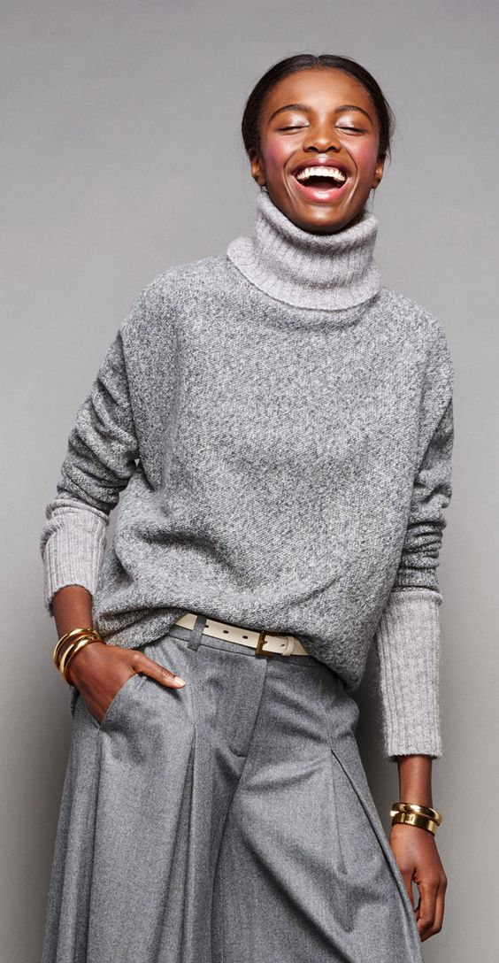 Nothing says spring quite like a soft, casual turtleneck in a cheerful grey. This woman’s knit sweater is the epitome of minimalist and classic, with a size-inclusive fit that drapes beautifully for a relaxed look. It’s a perfect transitional piece from winter outfits to lighter spring layers, keeping you warm on cooler days.