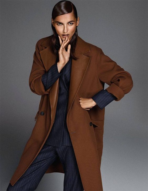 When the cold lingers, a well-tailored overcoat is a spring capsule wardrobe essential. This particular piece showcases a trendy oversized fit without sacrificing a woman’s shape, thanks to its structured design. The rich brown tone layers beautifully over a classic pinstripe suit, offering a modest yet hot look for the workplace or an evening event.