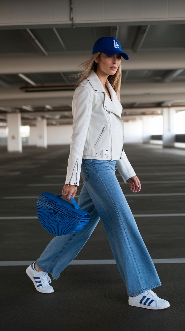 A white leather biker jacket is paired with wide-leg blue jeans and white sneakers for a comfy and relaxed look. The bold blue baseball cap and matching handbag add a playful touch, ideal for women simple streetwear style.