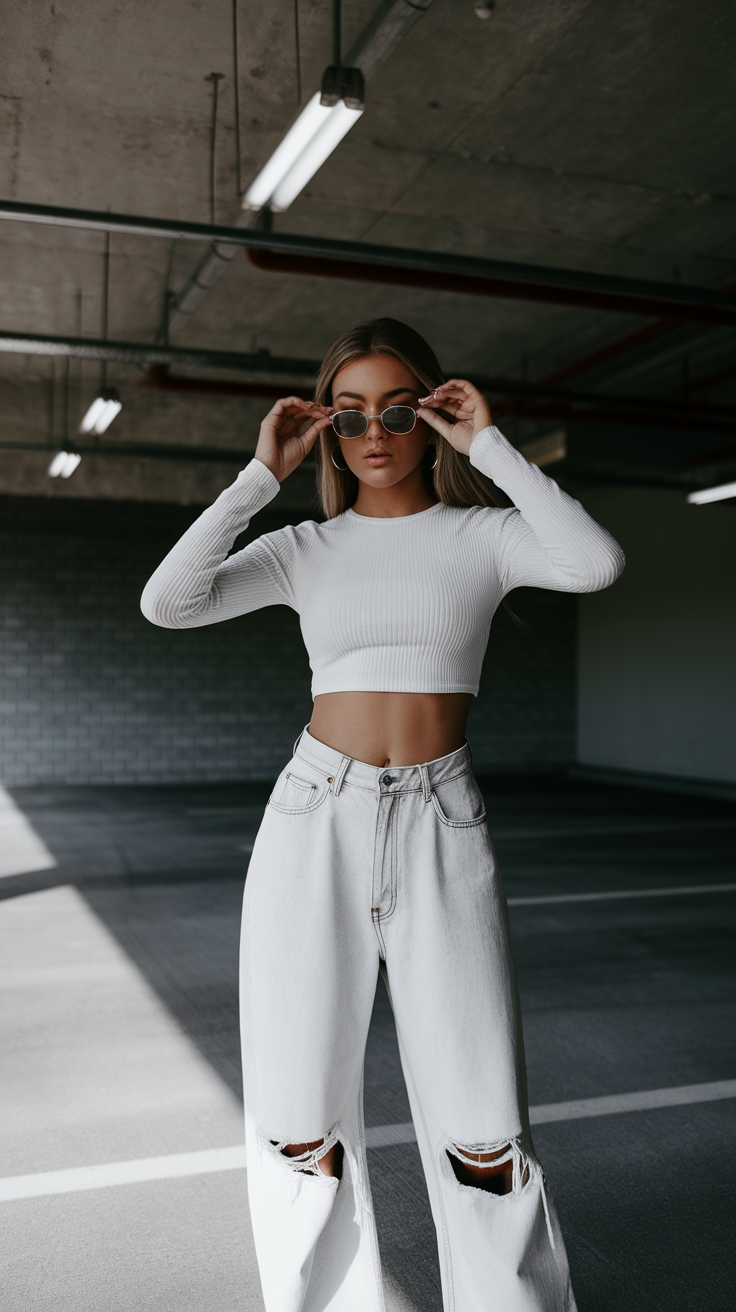 A ribbed white cropped top is styled with high-waisted white distressed jeans for a clean and edgy outfit. This model off duty style combines daily dress simplicity with a modern twist perfect for fashion inspo.