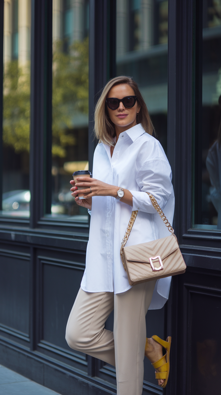 A crisp white oversized shirt is styled with beige tailored trousers and mustard flat sandals for a polished yet casual vibe. The quilted nude handbag completes this business casual look, blending women over 50 fashion with effortless style.