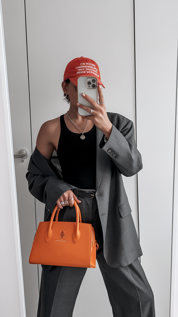 This outfit features a loose gray tailored suit layered over a black tank top for a sleek and modern look. The bold orange handbag and red cap add a playful twist, giving this business casual look a fresh fashion inspo edge.