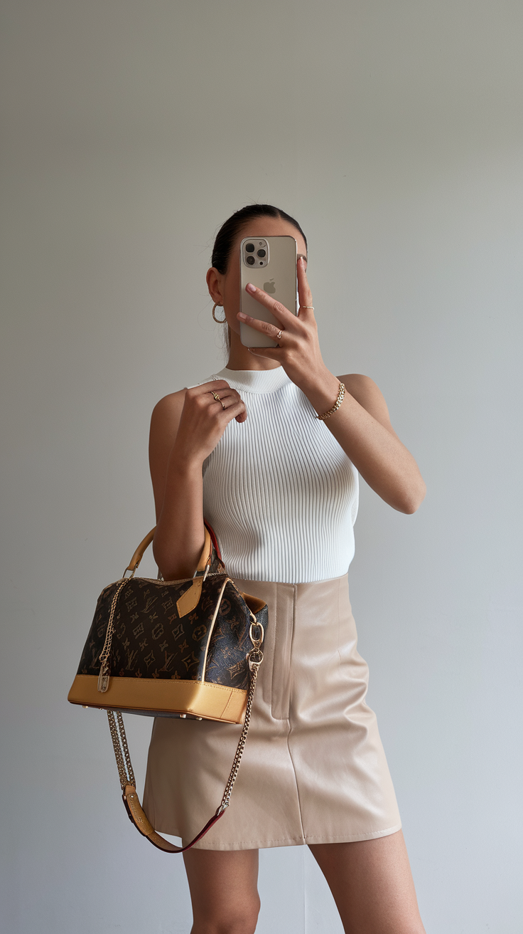 A ribbed white sleeveless top is paired with a beige leather mini skirt for a polished and minimalist look. The structured designer handbag elevates the women formal wear vibe while maintaining summer style women charm.