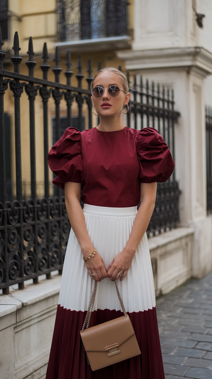 A burgundy puff-sleeve blouse is styled with a pleated midi skirt in a striking red-and-white color block design. The neutral-tone handbag and delicate jewelry complete this celebrity style ensemble, perfect for womens formal wear.