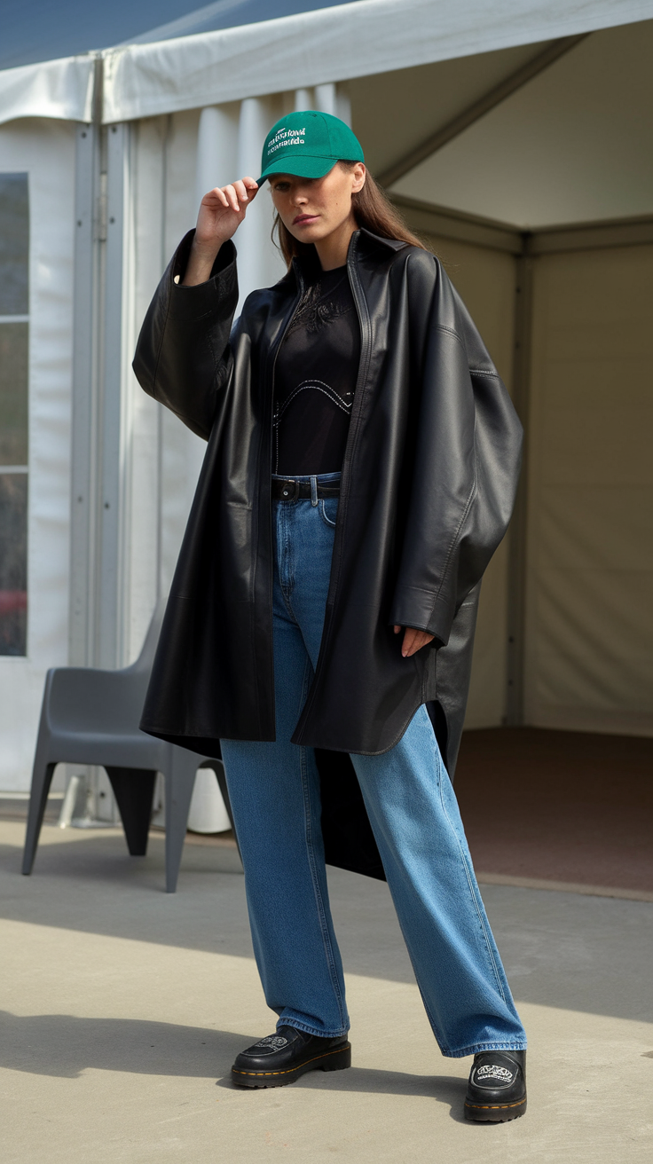 A long black leather coat is layered over a fitted black top and straight-leg blue jeans for a bold, minimalist look. The outfit is finished with chunky black loafers and a green cap, adding a touch of casual outfits ideas 2025 flair.
