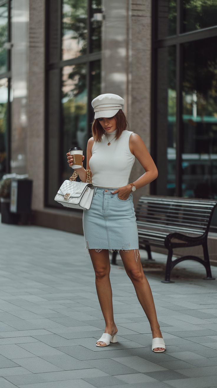 A ribbed white sleeveless top is paired with a light-wash denim mini skirt for a women summer style. White slide-on heels and a quilted handbag give this outfit a model off duty style touch.