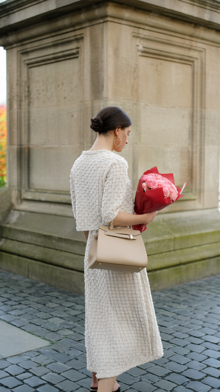 This outfit features a textured cream two-piece dress with a cropped top and midi skirt, exuding a soft, feminine look. Paired with a structured beige handbag, this ensemble is perfect for womens formal wear with an understated summer style.