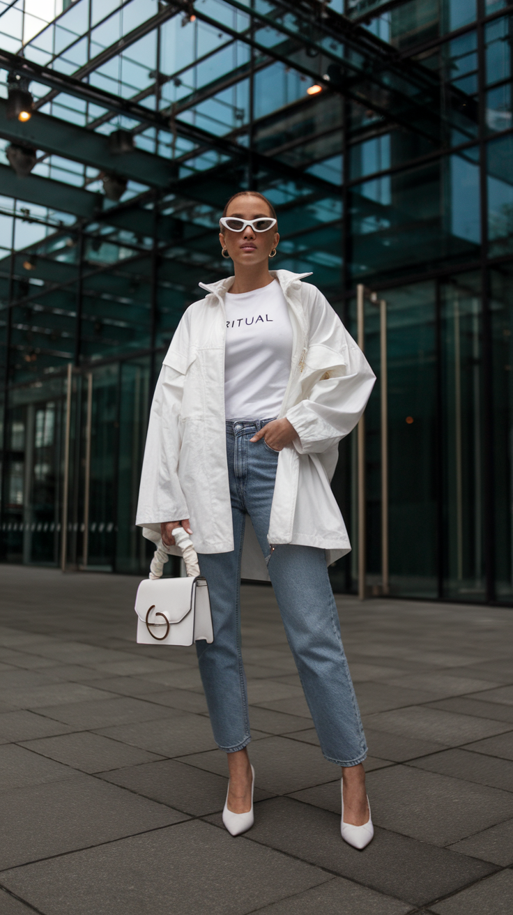 A white oversized jacket is layered over a graphic T-shirt and paired with straight-leg blue jeans for a polished yet casual look. Pointed white heels and a structured white handbag complete this business casual and women summer ensemble.