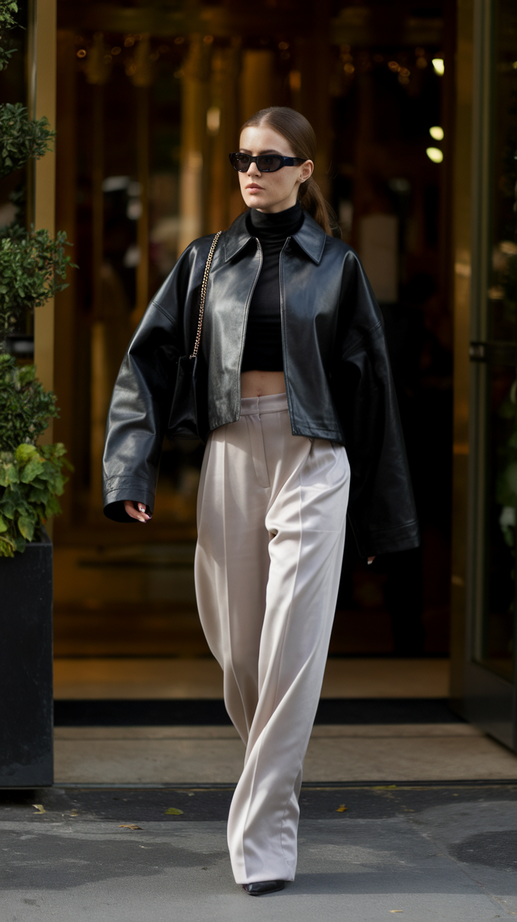A cropped black leather jacket is paired with high-waisted cream wide-leg trousers, creating a sleek contrast. Minimalist details like a black turtleneck and a chain-strap handbag elevate this business casual ensemble.
