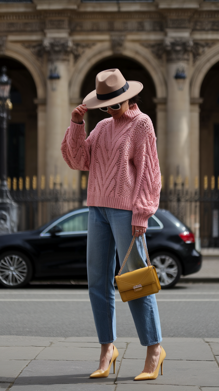 A chunky pink cable-knit sweater is paired with relaxed-fit blue jeans for a warm and stylish look. Yellow heels and a structured handbag add a pop of color, making this comfy outfit perfect for women simple fashion.