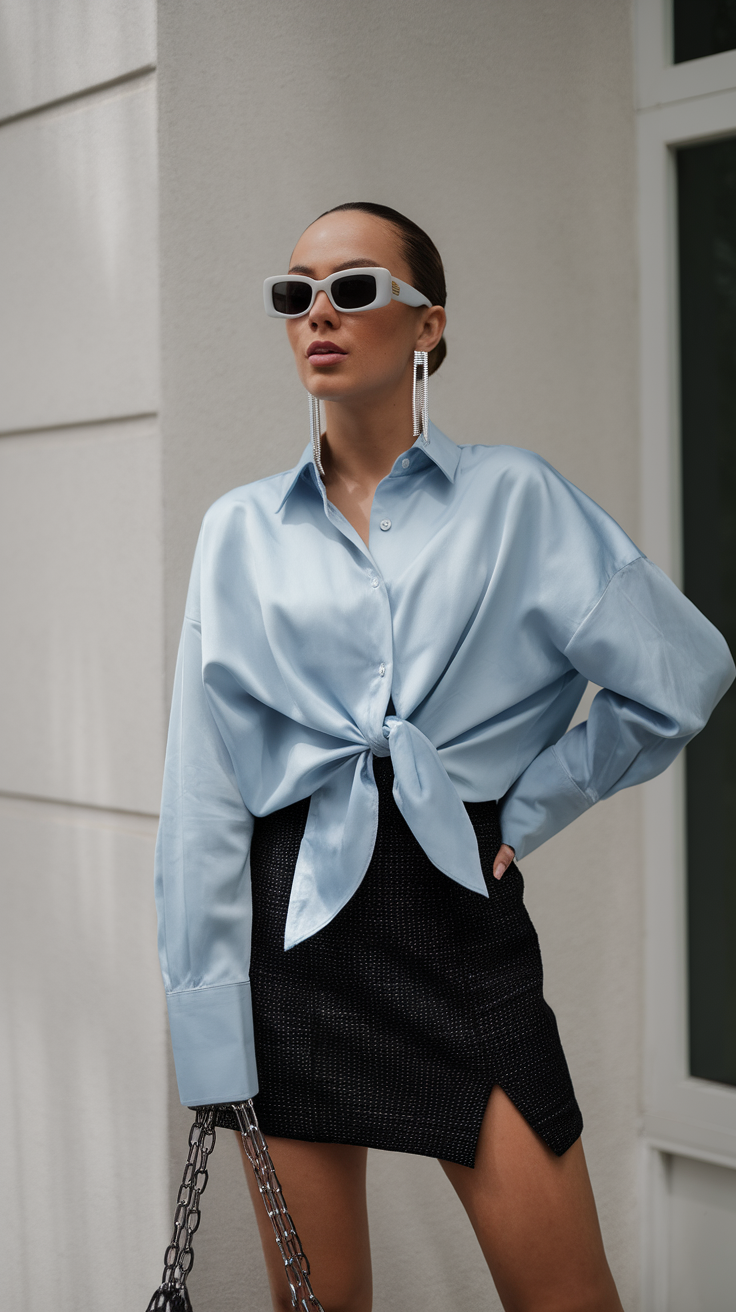 A satin blue blouse tied at the waist is paired with a black textured mini skirt for a sleek, polished look. Oversized statement earrings and a chain handbag add a fashion inspo touch, ideal for women formal wear.