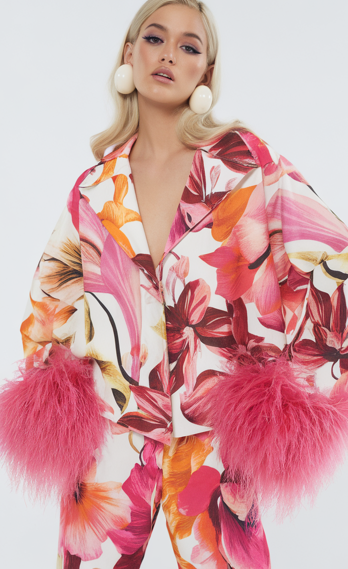 This floral blouse features a bold mix of pink, orange, and red tones, making it a statement piece for spring. The oversized fit is complemented by dramatic pink feather cuffs, adding a playful and luxurious touch. A perfect choice for women looking to elevate their spring shirt outfits 2025 with vibrant, eye-catching designs.