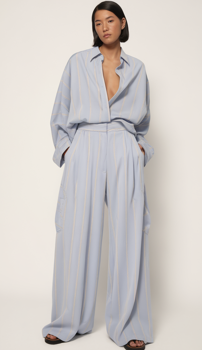 This blue striped button shirt is paired with matching wide-leg trousers for a monochromatic and relaxed spring look. The oversized fit and soft yellow stripe detailing add subtle elegance to the ensemble. Ideal for women seeking effortless, coordinated outfits for casual or semi-formal settings.