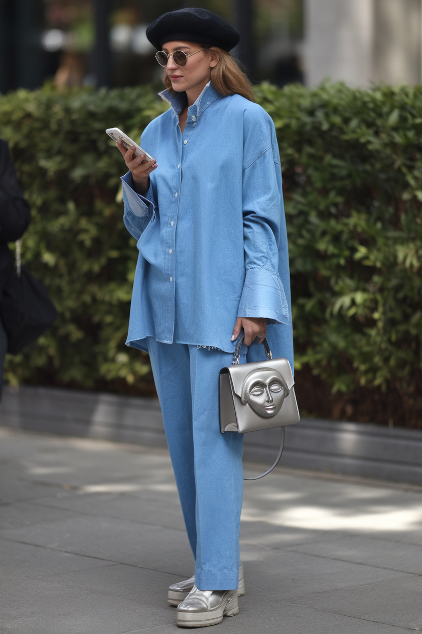 This oversized denim button shirt is paired with matching wide-leg pants, creating a monochromatic, street-style look. The frayed hem details and loose fit give it a casual yet bold vibe, perfect for women looking to stand out in spring shirt outfits 2025. Styled with metallic accessories and a beret, it’s both trendy and unique.