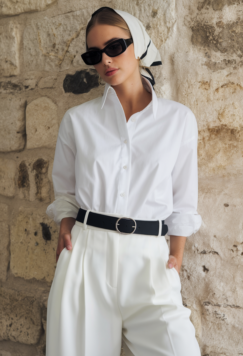 A crisp white button shirt is tucked into tailored, high-waisted white trousers for a sleek and sophisticated spring outfit. The addition of a wide black belt adds a defining touch to the monochrome look. Perfect for women seeking elegant yet minimalistic styling.
