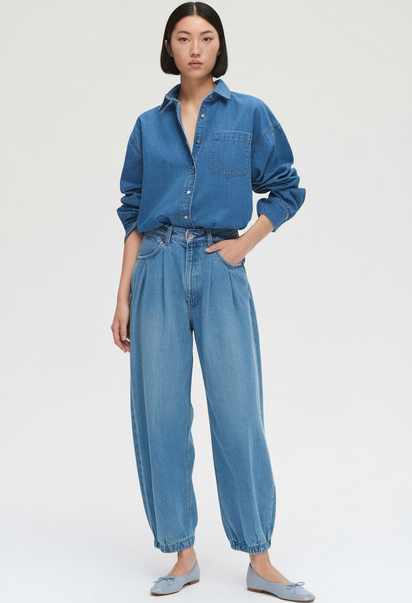 This denim button shirt in a medium wash is paired with relaxed jogger-style jeans for an effortlessly cool vibe. The loose fit and casual pairing create a practical yet stylish outfit for spring. A great choice for women who prefer comfort without sacrificing fashion.