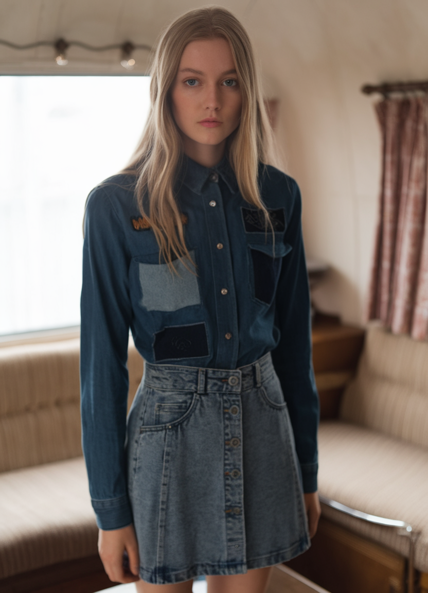 This denim button shirt stands out with patchwork detailing in various shades of blue, adding depth to the design. Paired with a high-waisted, denim button A-line skirt, the outfit creates a cohesive and retro-inspired look. Perfect for women embracing playful yet structured spring shirt outfits 2025.