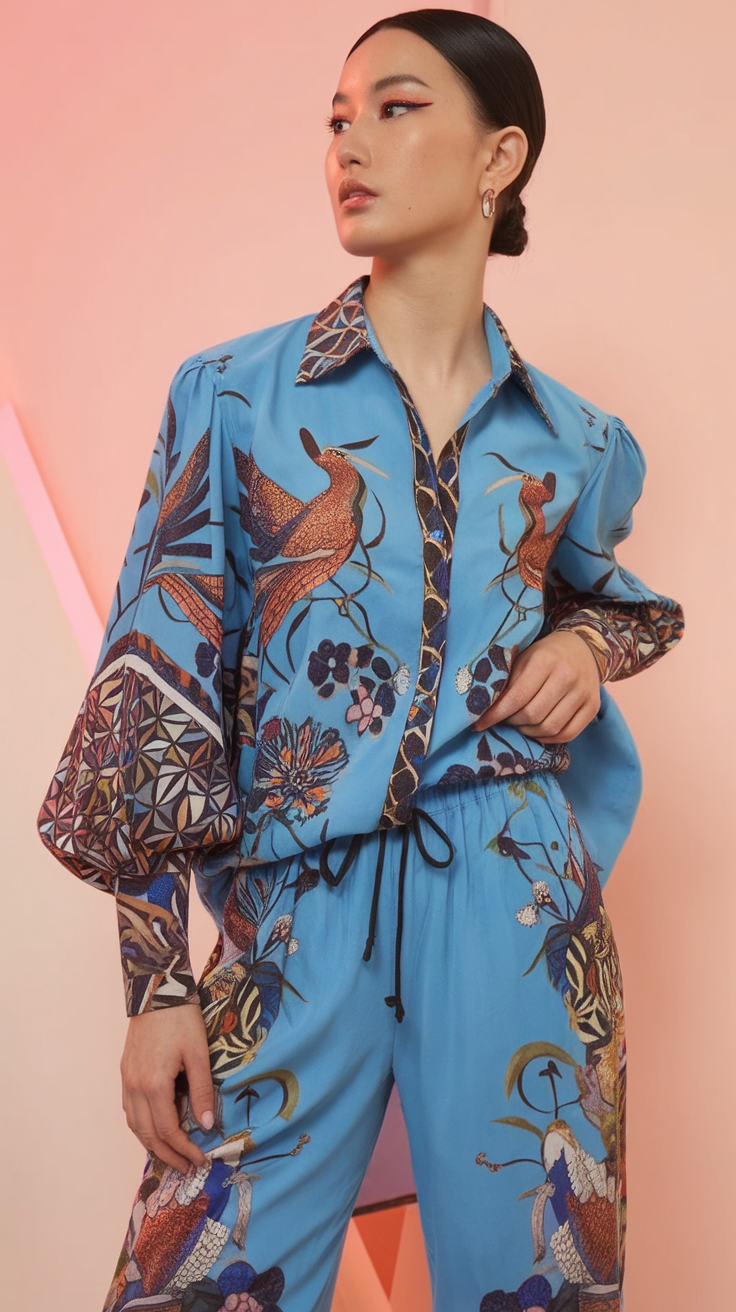 This floral blouse stands out with its bold blue shade and intricate nature-inspired patterns. The slightly oversized fit, paired with matching trousers, creates a harmonious and artistic spring outfit. A great choice for women who love vibrant, coordinated ensembles.