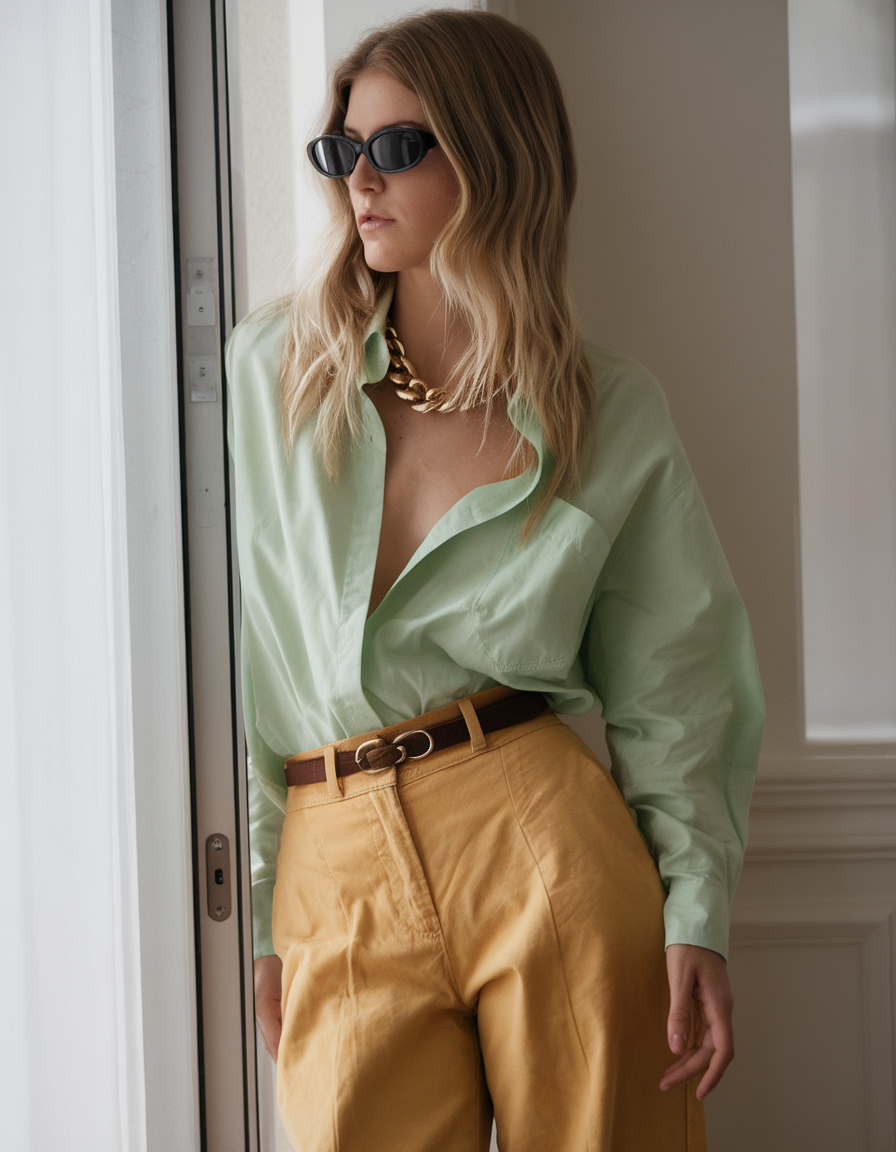A loose, oversized mint-green button-up shirt is elegantly styled with high-waisted mustard trousers. The shirt is lightly tucked in, allowing its relaxed fit to balance the structured pants. A chunky gold necklace and a leather belt complete the sophisticated yet playful look.