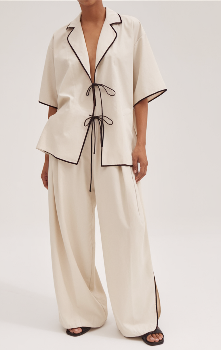 This cream-colored button-up top features black piped edges and a unique tie-front closure for a minimalist design. Its matching wide-leg pants flow seamlessly, offering a relaxed yet tailored appearance. The monochrome palette enhances its sleek and modern aesthetic.