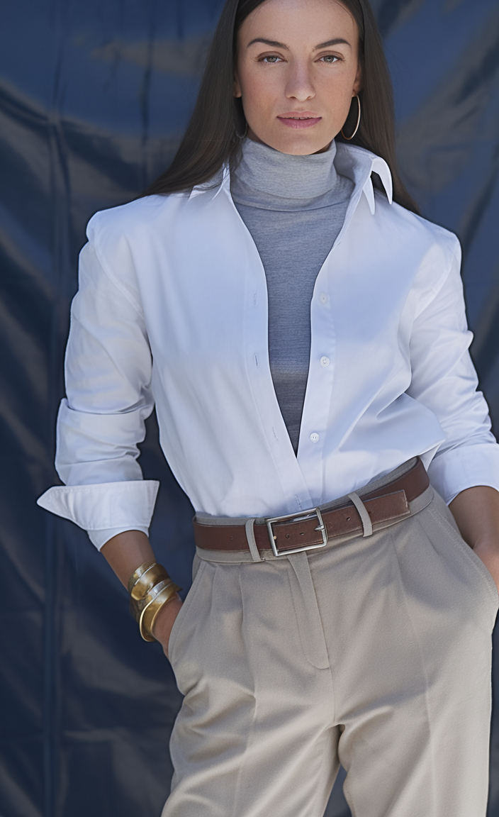 A crisp white button-down shirt serves as the foundation of this timeless look, layered over a sleek gray turtleneck. The tailored beige trousers sit high on the waist, cinched with a classic brown leather belt. The overall effect is polished and versatile, ideal for both professional and casual settings.