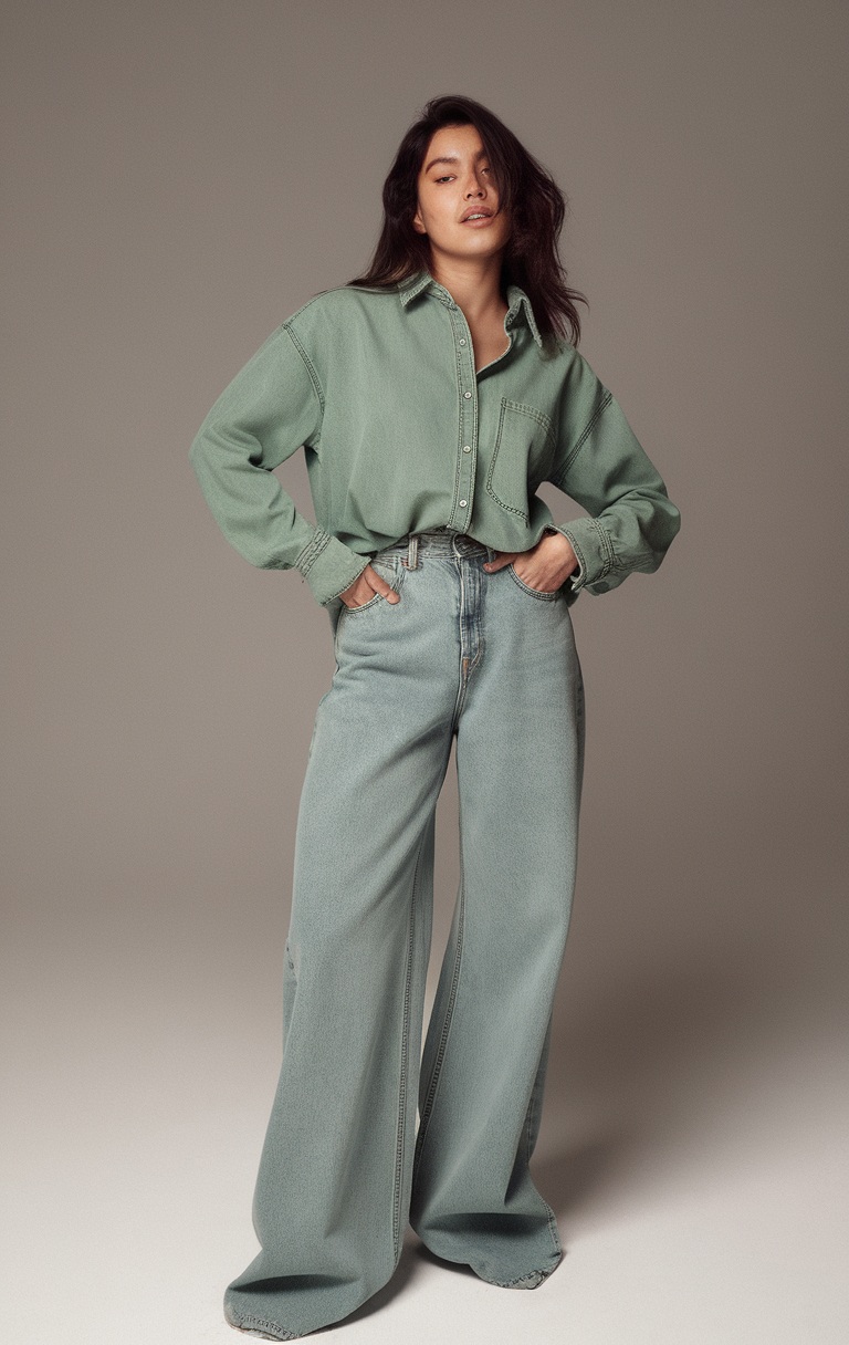This monochromatic look combines a muted green oversized denim shirt with matching wide-leg denim pants. The shirt’s relaxed fit is complemented by structured details like a pointed collar and patch pocket. The loose-fitting jeans add a contemporary edge, making this outfit effortlessly trendy.