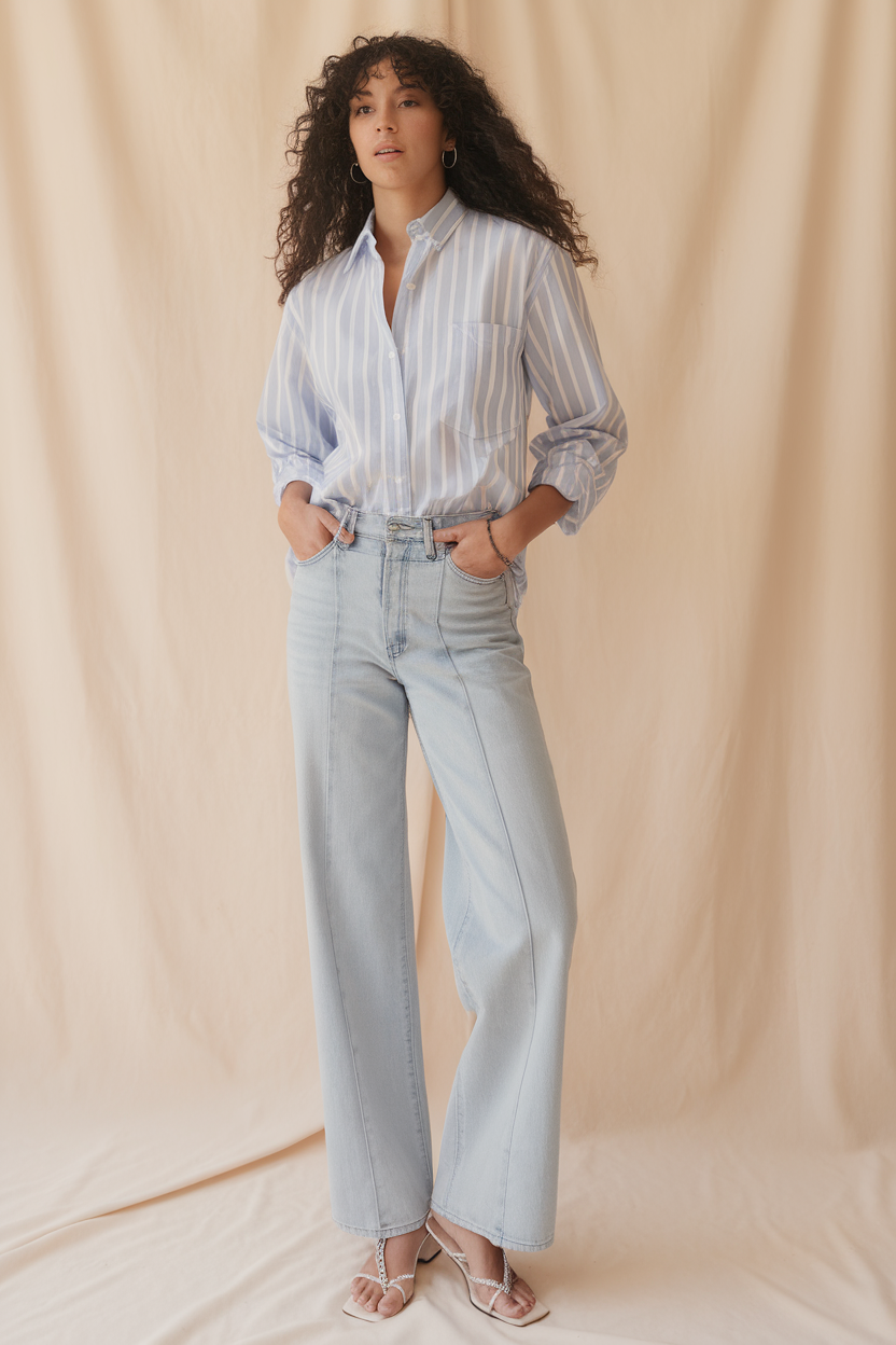 #7 Light Blue Striped Button-Down with Wide-Leg Jeans