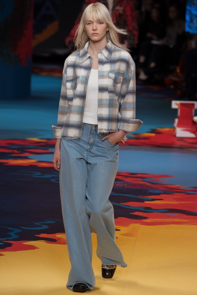 This plaid shirt features soft blue and beige tones with frayed edges for a relaxed vibe. Styled with light-wash jeans and a fitted white tank top, it’s a comfortable yet fashionable choice for spring. A great option for women embracing laid-back casual trends.
