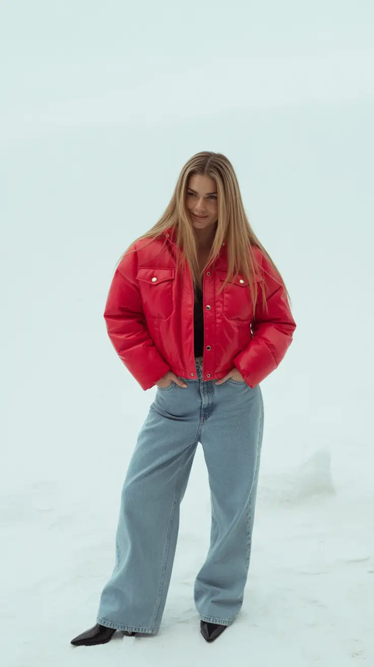 Somewhere along the road, we agreed that winter means mountains of gray and nothing else. But we’ve got a droppable rebuttal loud enough to melt the tundra: a cherry-red cropped puffer that struts with its own heat. It does the warming and the wow-ing in one go, making neutral talkers rethink their entire closet. Wide-leg jeans and a quick slip of pointed black boots underneath seal the deal, proving classy can own the fast lane, too.