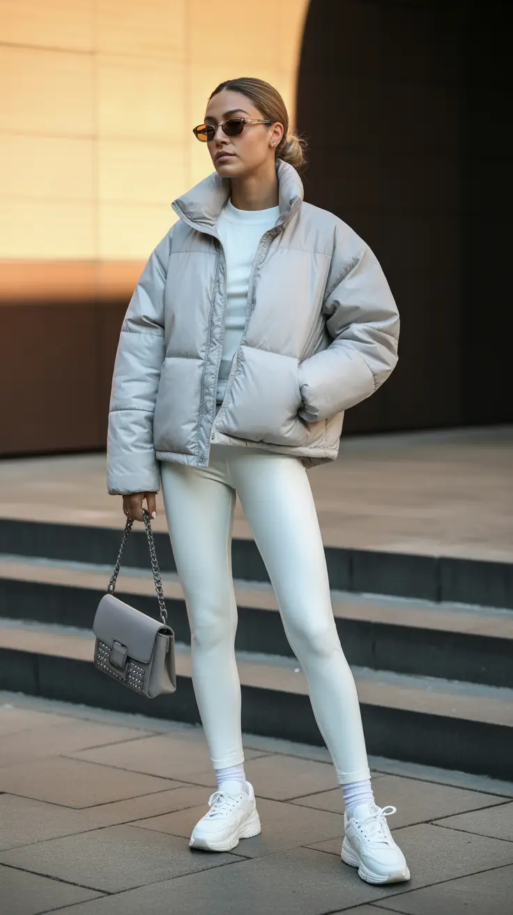 The coziest winter outfits are the ones that keep things simple but nail the details. This one takes muted neutrals and turns them into an effortless shield against the chill. Picture a soft grey puffer, leggings in the same icy hue, and white sneakers that give major weekend vibes but just a little more polish—think the vibe of bold street sneakers but more grown-up. Finish the whole thing with those tiny micro sunnies, and you get a look that’s clean, cool, and undeniably chic.