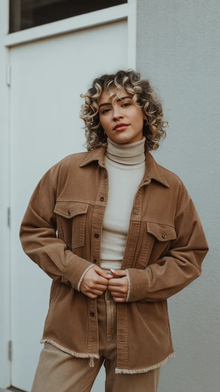 Seriously, is there a cozier fabric than warm-hued corduroy? I put together this set, and the vibe really sold me. The outfit features a neutral ribbed turtleneck layered under a matching, caramel-toned corduroy button-up and tapered pants, which celebrates that perfect balance between vintage nostalgia and modern cool. You just know this is the look you’d slide into for a laid-back Saturday museum stroll or a lazy Sunday beans-and-brunch-date. Smart? Yep. Cozy? Absolutely. It’s the kind of outfit that lets you have it all.
