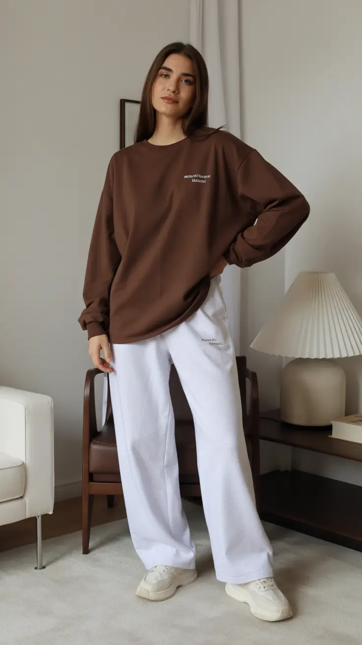 This outfit leans hard on pure ease, reminding us that simple can still feel intentional. A rich cocoa-toned oversized sweatshirt hugs every right angle, pairing like a hug with neat white sweatpants. Ideal for the WFH routine that suddenly feels a bit fancy, or that early Saturday grocery run that begs for a slight power move. The vibe? Quiet confidence stitched into every seam, no mic needed.