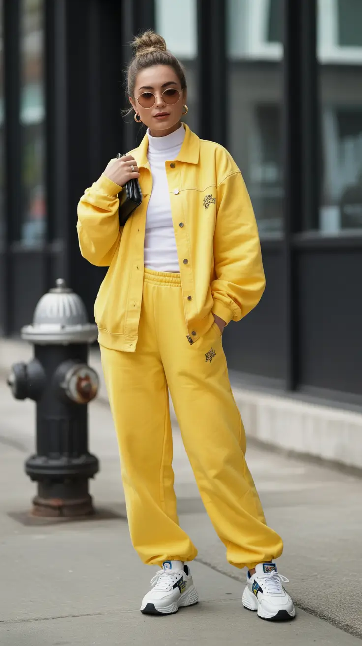 Dopamine dressing, baby! Rock a sunny, buttery yellow co-ord sweatsuit with fresh white layers peeking out underneath—plus an attitude that could melt snow. The fit is a lit-t-le bit oversized, but everything is just tailored enough that it stays sharp, not sloppy. Consider it the answer for the girl whose 2025-2026 casual winter outfits need to glow, even when ice is forming outside.