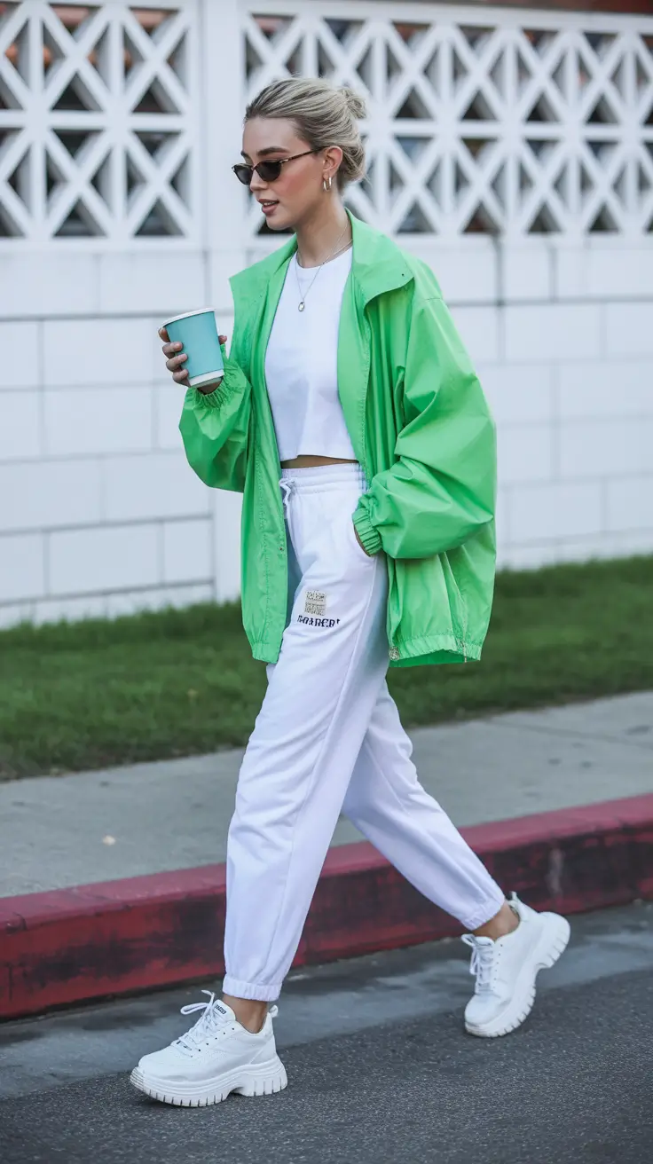 Let’s dive into the power of color choices here. The bright green adds that playful zing needed to wake up winter’s usual gray vibes. White joggers teamed with platform-style white sneakers (think crossover between Converse and something a little dressier) keep the look balanced, while the cropped top pipes in some youthful energy. When the temps drop? Swap in a cozy fleece and keep that vibe intact. The overall feel is elevated streetwear—like athleisure leveled up and sprinkled with edge.