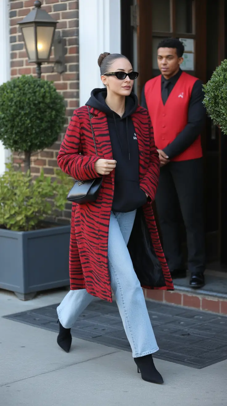 There’s something magnetic about wild prints and lasting basics landing on the same hanger. This red-and-black zebra coat tossed over a black hoodie and light-wash straight jeans nails that swing between playful and polished. Pointed black sock boots slipping under the hem? Absolute applause moment. It’s a real-women “classy” meets “head-cold when the city winds meet” ensemble.