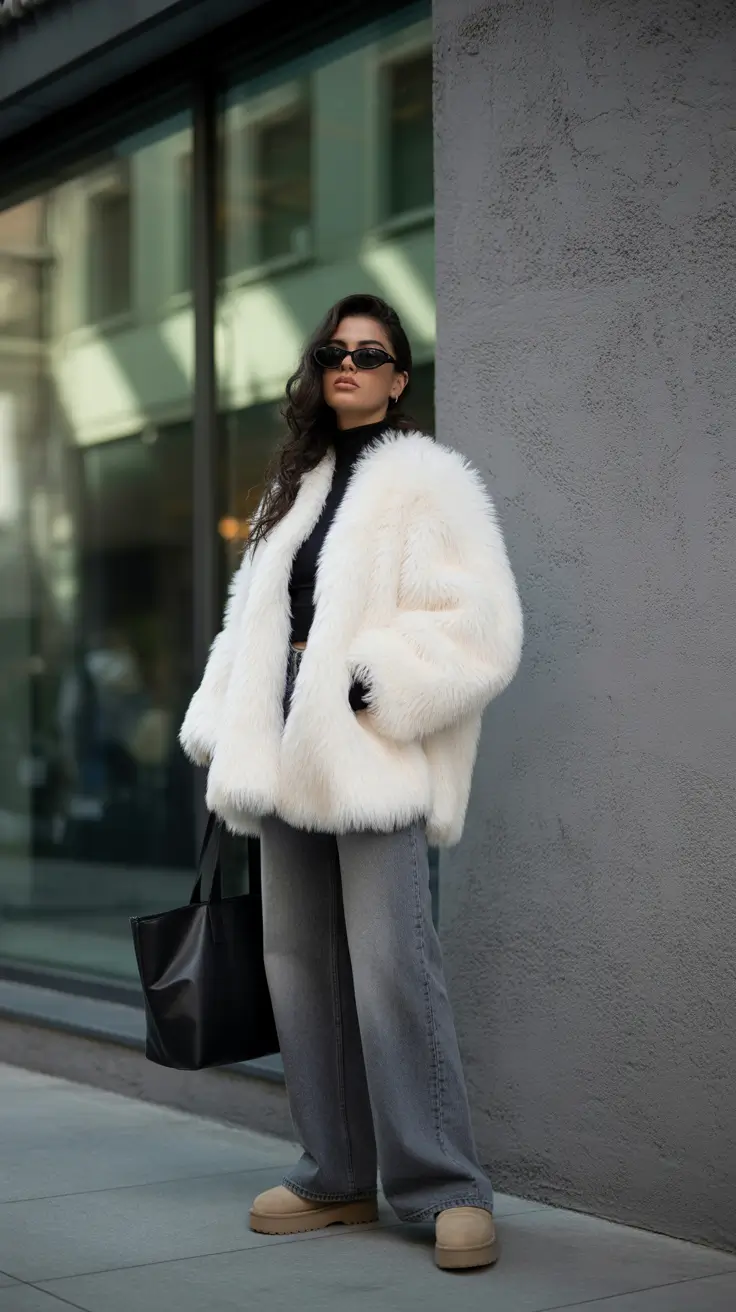 Picture cozy glamour made for the city. You throw on a fluffy white faux-fur coat draped over wide-leg charcoal denim, then slip into tan UGG-style boots. It’s big and bold—like your go-to winter throw coming to life and strutting down the sidewalk. Talk about a signal that UGG boots are totally back and stealing the spotlight again.
