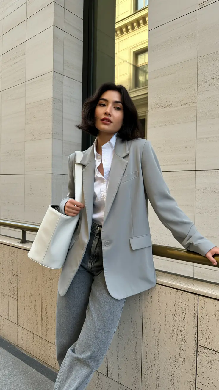 When that winter chill is real, yet a low-key meeting or brunch in the city is still on the agenda, this outfit is the secret weapon. Oversized pale grey blazer layered over a crisp white shirt, finished off with faded straight-leg jeans—everything screams, “I’m in charge, and the cold doesn’t demand a meltdown.” Simple, minimal, and quietly sharp.