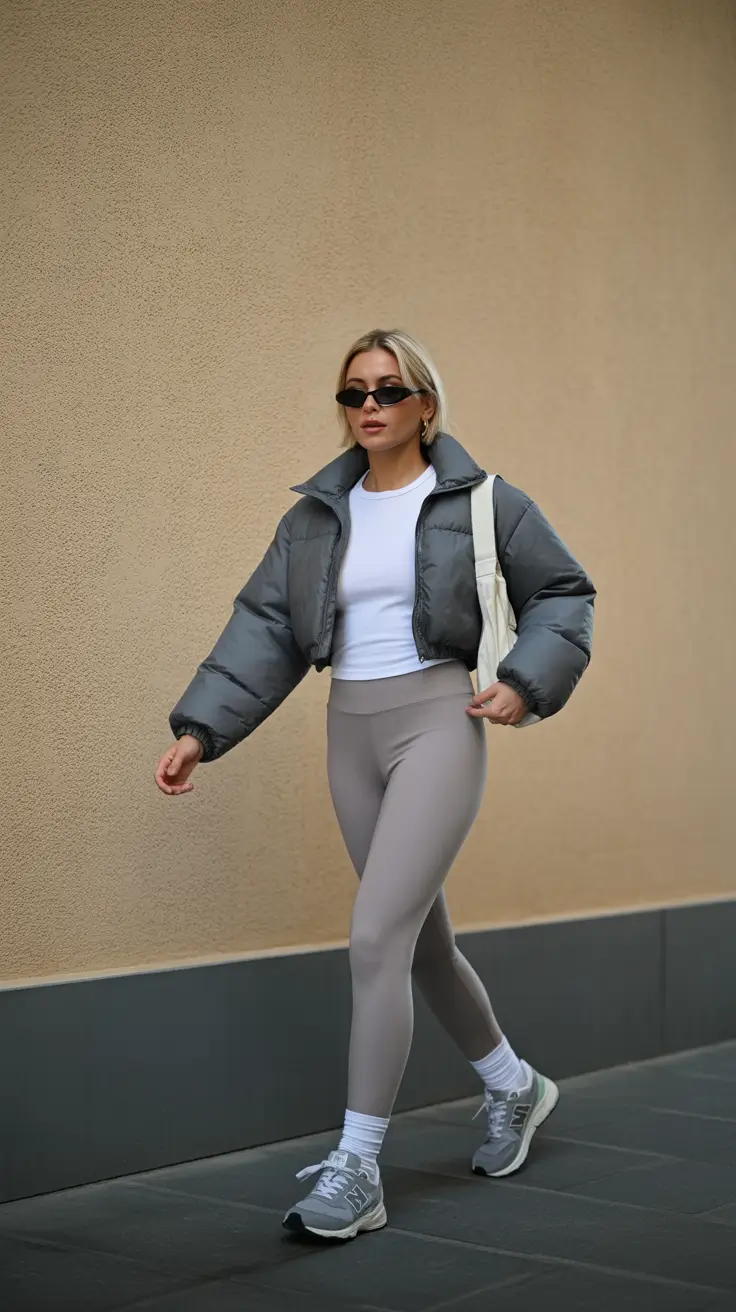 These warm taupe leggings are magic for in-between seasons—supportive, cozy, and happy to team up with anything you choose. A cropped puffer jacket, like the one in the pic, gives just the right amount of structure without the bulk; it’s that cropped sweet spot. The whole comfy sneaker trend isn’t going anywhere, especially when you crave that city-ready, chic practicality.