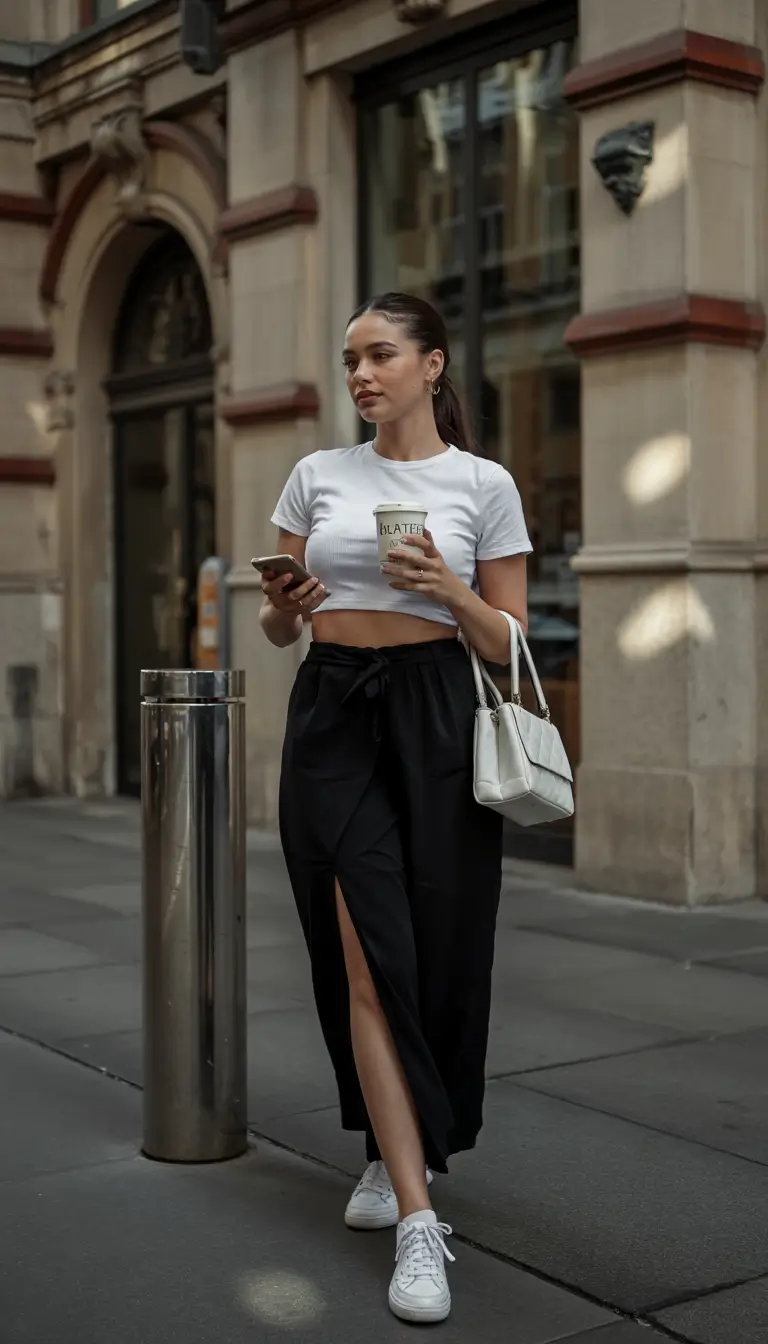 This street-style ensemble combines a white cropped top with a black slit skirt that reveals part of the front when worn with sneakers. The skirt features a casual tie-front design, giving it a casual quality that seeks the perfect blend between visiting London cafes and warm city walks. Clean white sneakers provide a modern everyday style for comfortable outfits. The outfit is a mix of women’s streetwear and summer-friendly elements, making it ideal for hot weather.