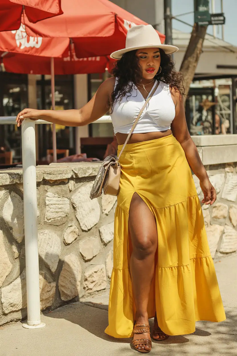 This soft green ensemble combines a strapless ruffle top with open sides with a maxi skirt that reveals the leg through a high side slit. This outfit works well in both tropical locales and offers casual charm during London strolls thanks to its comfortable fit and light airflow. The boho chic style of this outfit is transformed by the straw bag paired with heeled sandals. A standout in the curvy outfit ideas summer 2025 lineup for its relaxed elegance.